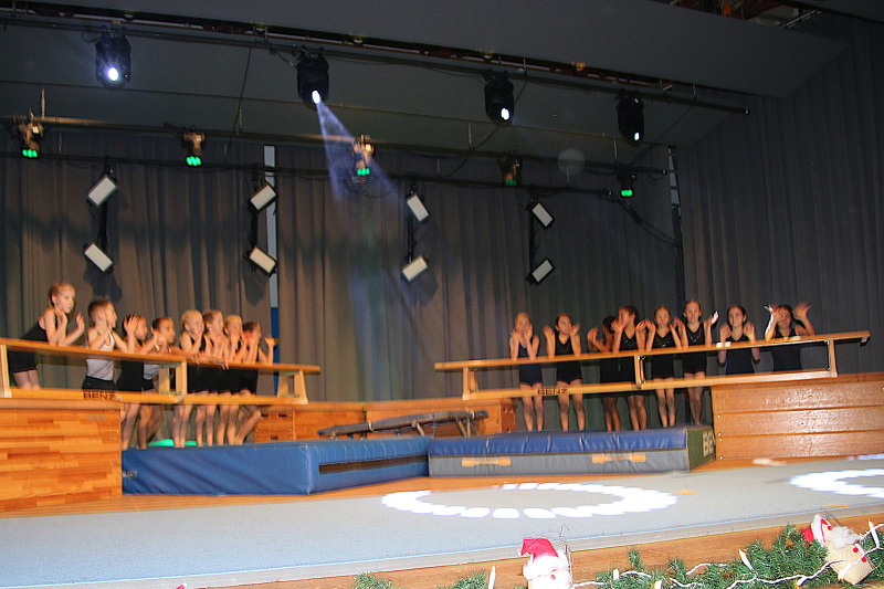 Einen überzeugenden Auftritt bot wieder mal das "Geräteturnen Mädchen": abwechselnd am verbreiterten Schwebebalken (Himmel) und am Boden (Erde) wirbelten die drei Turngruppen über die Bühne und zeigten, was sie in den Turnstunden gelernt hatten.